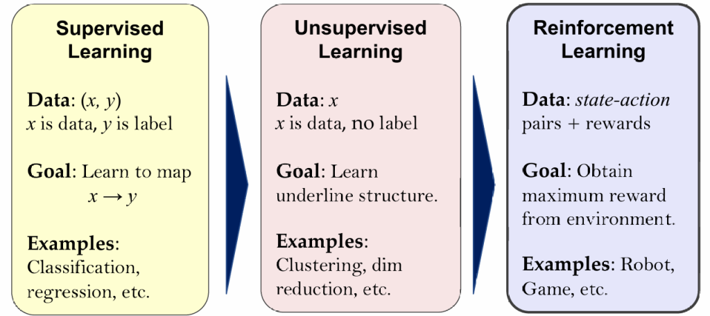 监督学习、无监督学习、强化学习对比: