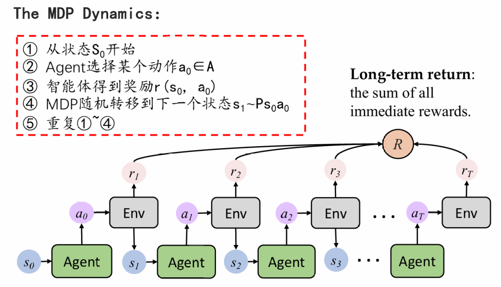 agent生成一个action,环境返回state和reward;agent再根据state生成新的action