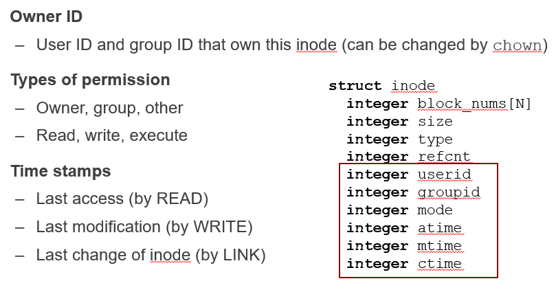 打开文件时,匹配userid、groupid、权限,然后更新last access time,最后返回一个fd