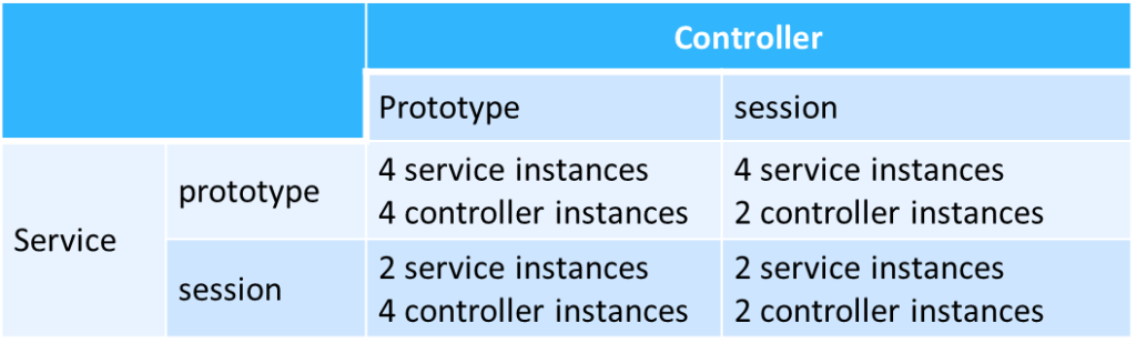 分别使用两个浏览器,每个发两次请求,controller和service采用不同的scope,会得到不同的实例数量